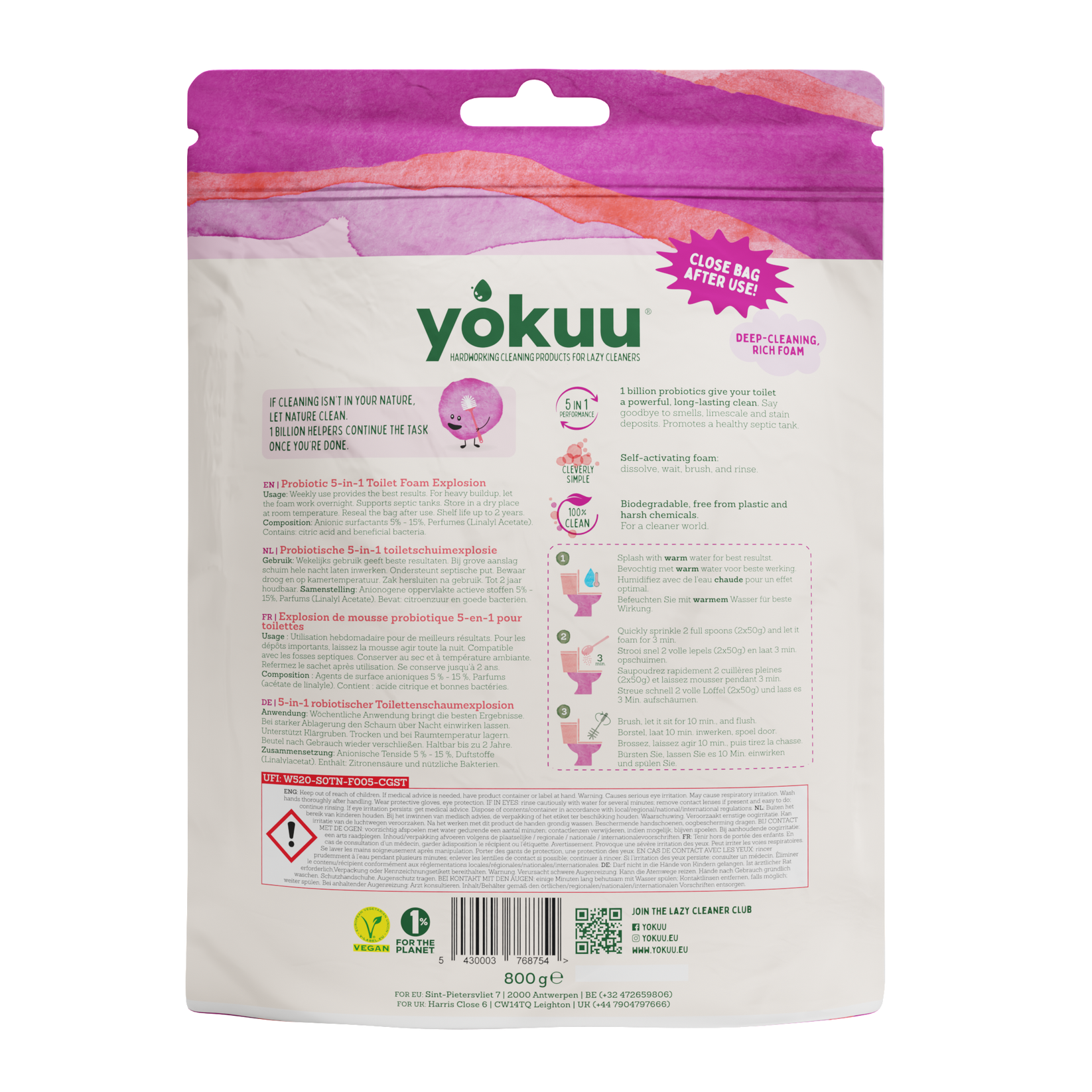 We don’t recommend mixing it with classic bleach- or acid-based cleaners, as they can interfere with the probiotics. You can alternate with YOKUU’s Toilet Bombs: use Foam Explosion once a week for deep cleaning, and Toilet Bombs in between for a quick refresh. Using both at the same time isn’t necessary – save the foam party 😉.